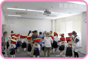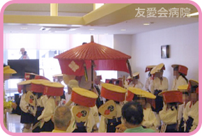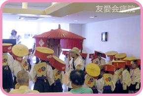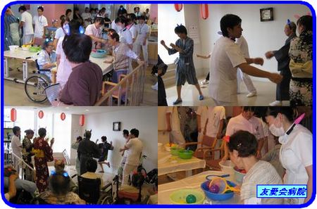 入院患者様、ご家族様に夏の気分を少しでも味わっていただきたいと考え 院内でのレクリエーションの一環と し て『 院内盆踊り』を開催しました。 |