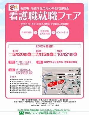 ・大阪府看護協会看護就職フェア 10/16(日)13時~17時 場所 京セラドーム大阪9階 |