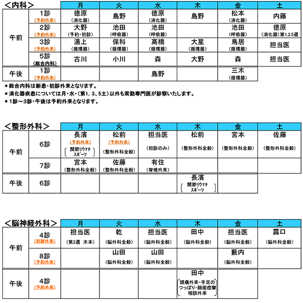 *整形外科・脳神経外科の( )内は担当医師の専門分野となりますが、各分野全般の診療に 対応致します。 〈全科共通〉 午前受付:8時40分~11時30分(診察開始9時00分) 午後受付:13時00分~15時30分(診察開始13時30分) *但し、一部の診療枠に限り、上記と異なる場合があります。 尚、電話による診療予約は行っておりません。ご了承ください。