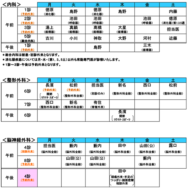 *整形外科・脳神経外科の( )内は担当医師の専門分野となりますが、各分野全般の診療に 対応致します。 〈全科共通〉 午前受付:8時40分~11時30分(診察開始9時00分) 午後受付:13時00分~15時30分(診察開始13時30分) *但し、一部の診療枠に限り、上記と異なる場合があります。 尚、電話による診療予約は行っておりません。ご了承ください。